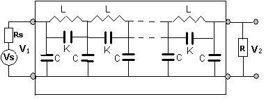 變壓器繞組的幅頻響應(yīng)特性采用圖1所示的頻率掃描方式獲得。連續(xù)改變外施正弦波激勵(lì)源VS的頻率f(角頻率ω=2πf),測(cè)量在不同頻率下的響應(yīng)端電壓V2和激勵(lì)端電壓V1的信號(hào)幅值之比,獲得指定激勵(lì)端和響應(yīng)端情況下繞組的幅頻響應(yīng)曲線。圖中:L、K及C分別代表繞組單位長(zhǎng)度的分布電感、分布電容及對(duì)地分布電容,V1、V2分別為等效網(wǎng)絡(luò)的激勵(lì)端電壓和響應(yīng)端電壓,VS為正弦波激勵(lì)信號(hào)源電壓,RS為信號(hào)源輸出阻抗,R為匹配電阻。