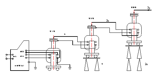 圖4:交直流干式試驗(yàn)變壓器接線 圖中:VD為高壓硅堆 3. 串級(jí)干式試驗(yàn)變壓器接線及原理:如圖5 串級(jí)干式試驗(yàn)變壓器有很大的優(yōu)越性,三臺(tái)試驗(yàn)變壓器串級(jí)連接可獲得更高的電壓,因?yàn)檎麄€(gè)試驗(yàn)裝置由幾臺(tái)單臺(tái)試驗(yàn)變壓器組成,單臺(tái)試驗(yàn)變壓器容量小、電壓低、重量輕,便于運(yùn)輸和安裝。它既然可串接成高出幾倍的單臺(tái)試驗(yàn)變壓器輸出電壓組合使用,又可分開(kāi)成幾套單臺(tái)試驗(yàn)變壓器單獨(dú)使用。整套裝置投資小,經(jīng)濟(jì)實(shí)惠。圖5中,在第一級(jí)和第二級(jí)的每個(gè)單元試驗(yàn)變壓器中都有一個(gè)勵(lì)磁繞組A1、C1和A2、C2。在串級(jí)試驗(yàn)變器基本原理圖中,低壓電源加在試驗(yàn)變壓器I的初級(jí)繞組a1x1上,單臺(tái)試驗(yàn)變壓Ⅰ、Ⅱ、Ⅲ的輸出電壓都是V。勵(lì)磁繞組A1、C1給第二級(jí)試驗(yàn)變壓器Ⅱ的初級(jí)繞組供電;第二級(jí)試驗(yàn)變壓器Ⅱ的勵(lì)磁繞組A2、C2給第三級(jí)試驗(yàn)變壓器Ⅲ的初級(jí)繞組供電。第二級(jí)試驗(yàn)變壓器Ⅱ和第三級(jí)試驗(yàn)變壓器Ⅲ的箱體分別處在對(duì)地為1V和2V的高電位上,所以箱體對(duì)地是絕緣的,試驗(yàn)變壓器I的箱體是接地的。這樣第一級(jí)、第二級(jí)、第三試驗(yàn)變壓器對(duì)地的額定輸出電壓分別為1V、2V、3V;其額定容量分別為3P、2P、1P。