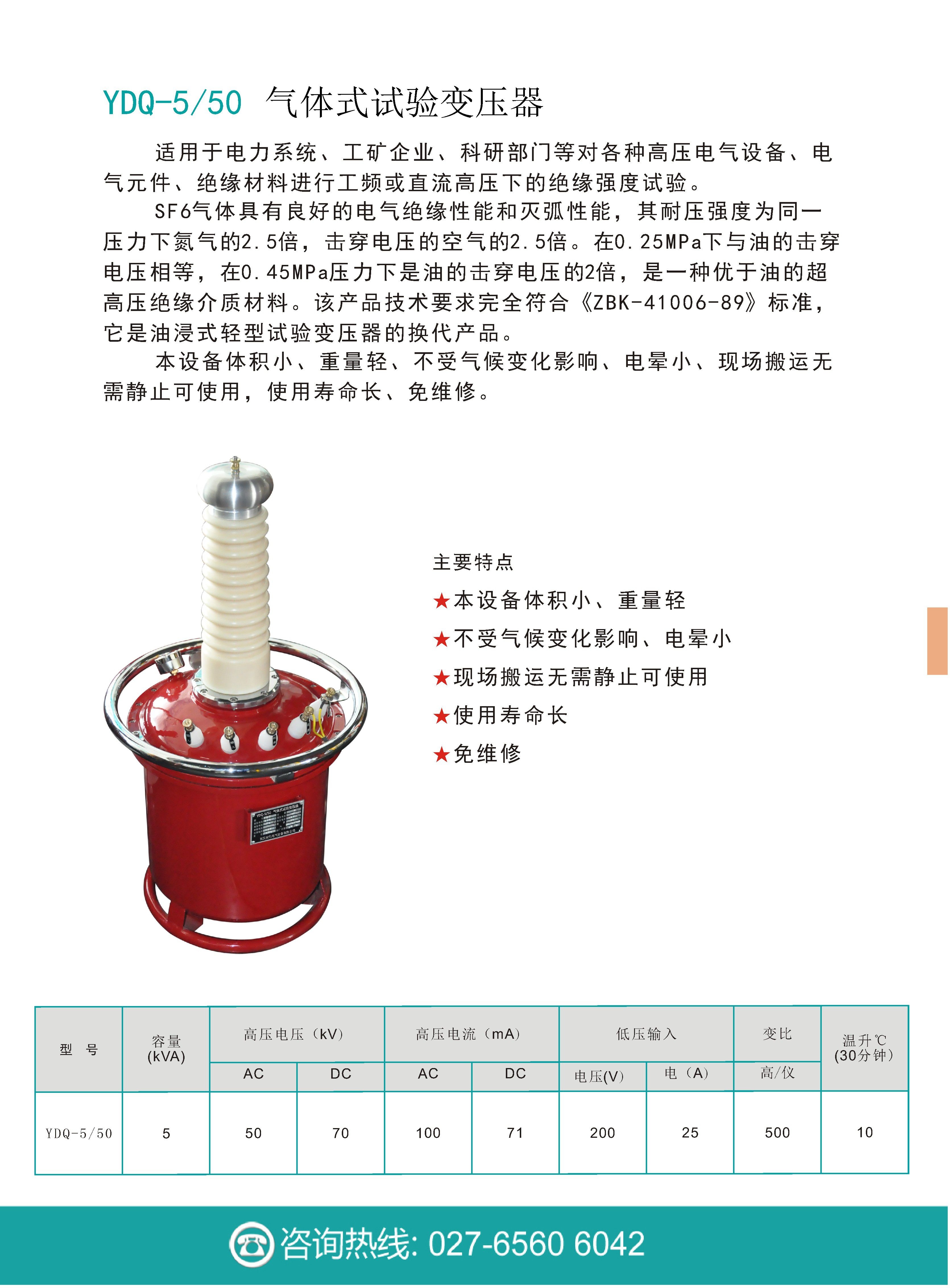 YDQ-5/50氣體式試驗變壓器是根據(jù)《試驗變壓器》標(biāo)準(zhǔn),在油浸式試驗變壓器的基礎(chǔ)上而設(shè)計生產(chǎn)的。SF6氣體具有良好的電氣絕緣性能及優(yōu)異的滅弧性能,其耐壓強度為同一壓力下氮氣的2.5倍,擊穿電壓的空氣的2.5倍。在0.25MPa下與油的擊穿電壓相等,在0.45MPa壓力下是油的擊穿電壓的2倍,是一種優(yōu)于油的新一代超高壓絕緣介質(zhì)材料。該產(chǎn)品技術(shù)要求完全符合《ZBK-41006-89》標(biāo)準(zhǔn),它是油浸式輕型試驗變壓器的換代產(chǎn)品。該產(chǎn)品具有體積小、重量輕、不受氣候變化影響、電暈小、現(xiàn)場搬運無需靜止可使用,使用壽命長、免維修等特點。適用于電力系統(tǒng)、工礦企業(yè)、科研部門等對各種高壓電氣設(shè)備、電氣元件、絕緣材料進(jìn)行工頻或直流高壓下的絕緣強度試驗。