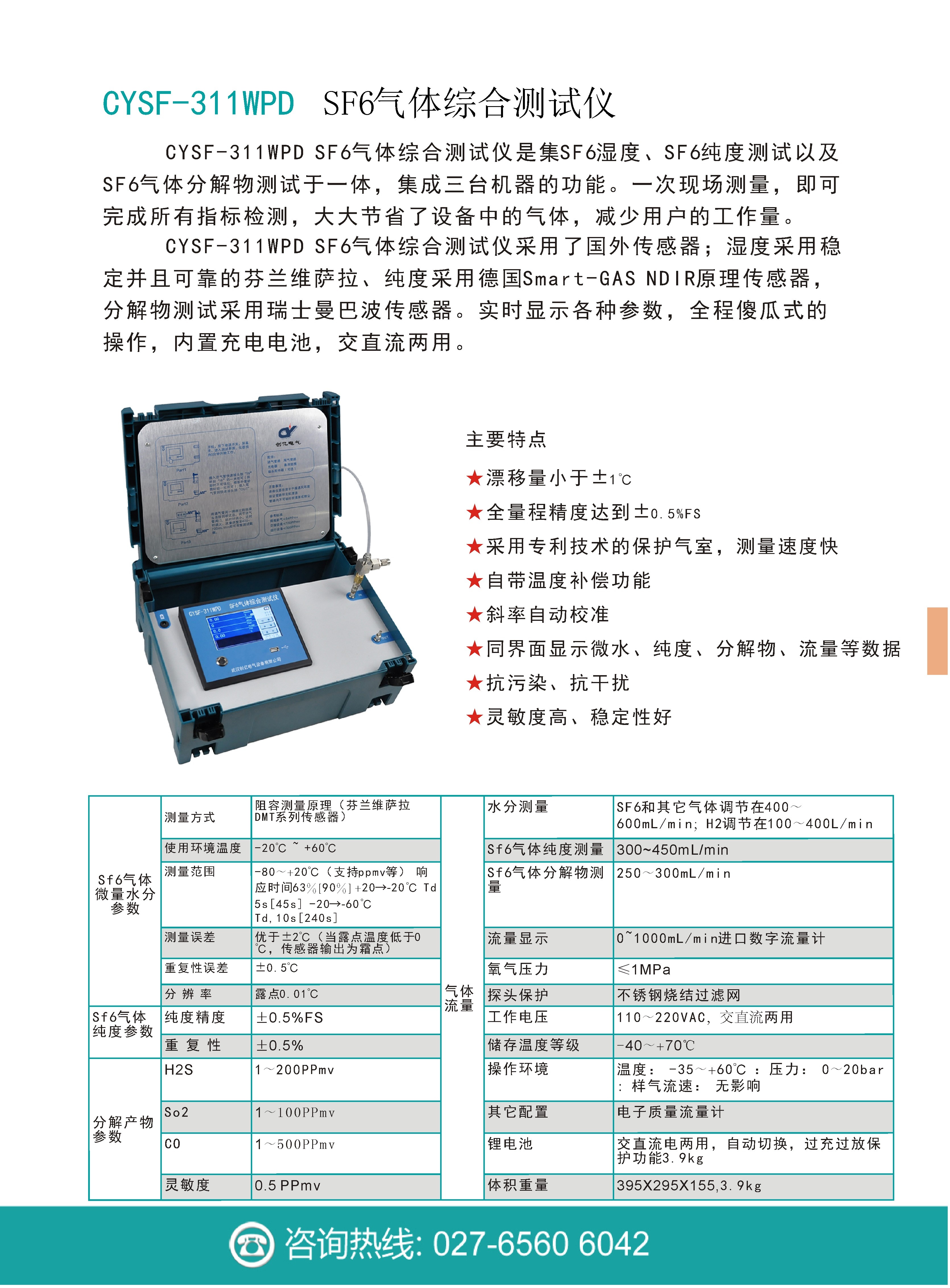 CYSF-311WPD SF6氣體綜合測試儀之所以有優(yōu)秀的性能,是因?yàn)槿坎捎昧藝獾膫鞲衅?;濕度采用穩(wěn)定并且可靠的芬蘭維薩拉、純度采用德國Smart-GASNDIR原理傳感器,分解物測試采用瑞士曼巴波傳感器。彩色液晶顯示,實(shí)時(shí)顯示各種參數(shù),全程傻瓜式的操作,內(nèi)置充電電池,交直流兩用。