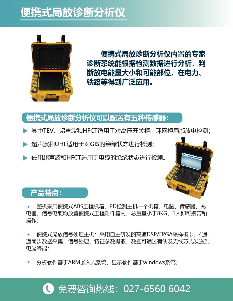 整機(jī)采用便攜式ABS工程機(jī)箱,PD檢測(cè)主機(jī)一個(gè)機(jī)箱、電腦、傳感器、充電器、信號(hào)電纜均放置便攜式工程附件箱內(nèi),總重量小于8KG,1人即可攜帶和操作