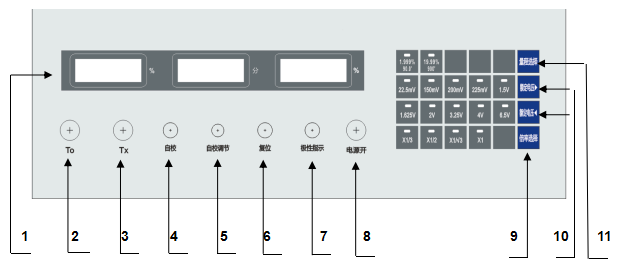 10— 額定電壓選擇按鍵。該按鍵必須和上圖中標號為9的按鍵組合使用,使設定的電壓與實際所測量的電子式電流(或電壓)互感器額定二次電壓相一致。